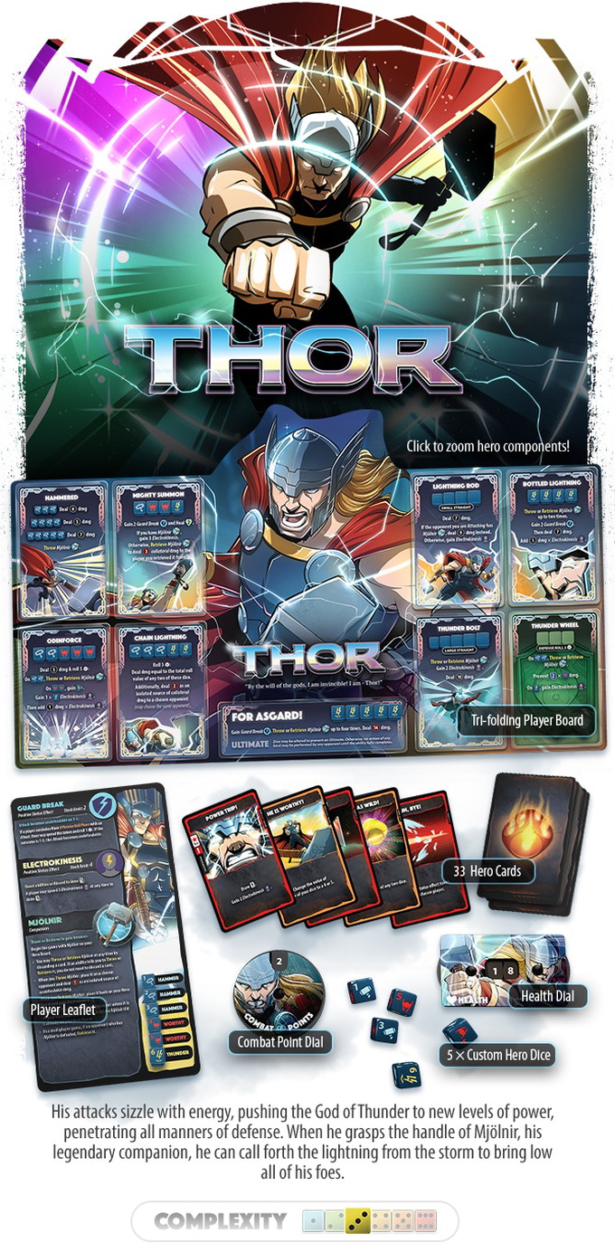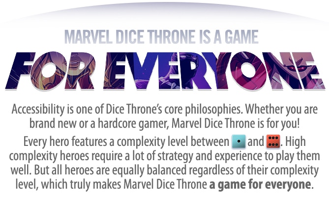 Marvel Dice Throne is a heart-pumping, fast-playing game of skilled card play and dice manipulation supporting multiple modes of play, including 1v1, 2v2, 3v3, 2v2v2, or free-for-all.