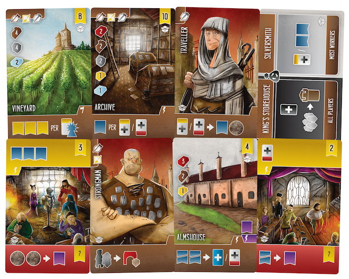 Included inside every copy of the Collector's Box are 14 Promo Cards: 3 Buildings; 6 Apprentices; 1 Contribution/Consequence; and 4 Craft Cards. All of these cards require both Works of Wonder and Age of Artisans to function, as they tie together elements from both expansions.