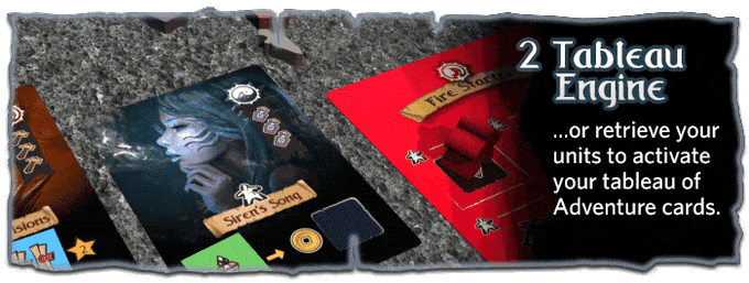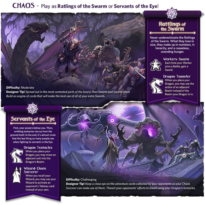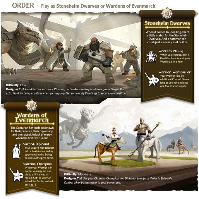 Dwellings of Eldervale blends worker placement, area control, engine building and unique worker units. Players take turns placing a worker in Eldervale or regrouping and activating their tableau of adventure cards. Action spaces include realms key to power: a summoning portal, an ancient mill, the lost fortress, deep dungeons, and a crumbling mage tower and the elemental lands of Earth, Air, Fire, Water, Light, Dark, Order and Chaos! Magic cards grant spells, quests and prophecies to players.