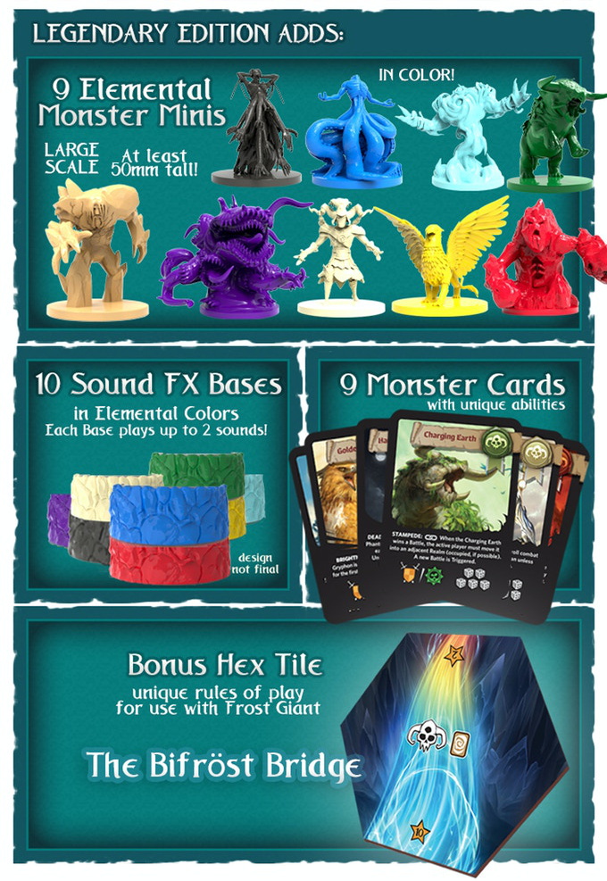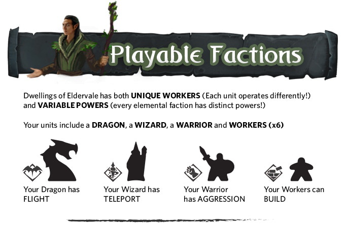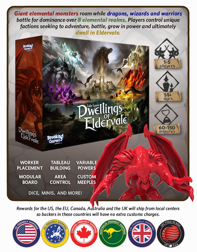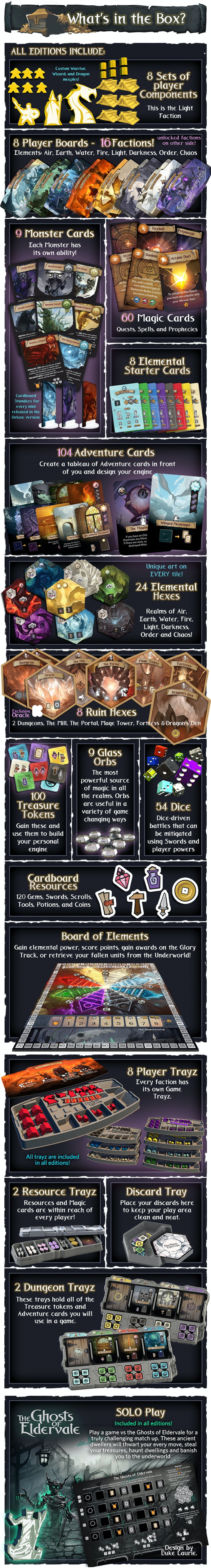 Dwellings of Eldervale is an epic worker placement game set in a once lost magical world. Giant elemental monsters roam while dragons, wizards and warriors battle for dominance over 8 elemental realms. Players control unique factions seeking to adventure, battle, grow in power and ultimately dwell Eldervale, shaping it to their vision.