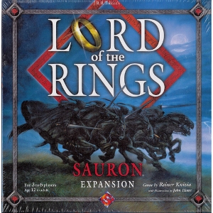 The second expansion for The Lord of the Rings adds a whole new dimension to the game play. With the Sauron expansion, the fellowship of Hobbits are no longer competing solely against the game and its boards. In Sauron, one player takes on the role of the dark lord and seeks to thwart the fellowship's crucial mission. The dark figure of a black rider joins the eye of Sauron on the master board, racing towards the fellowship with the help of new cards that are the domain of the dark lord alone. Now when the fellowship discusses plans of how to pass the next board or event and compare resources, the dark lord is listening, and using that knowledge against them!