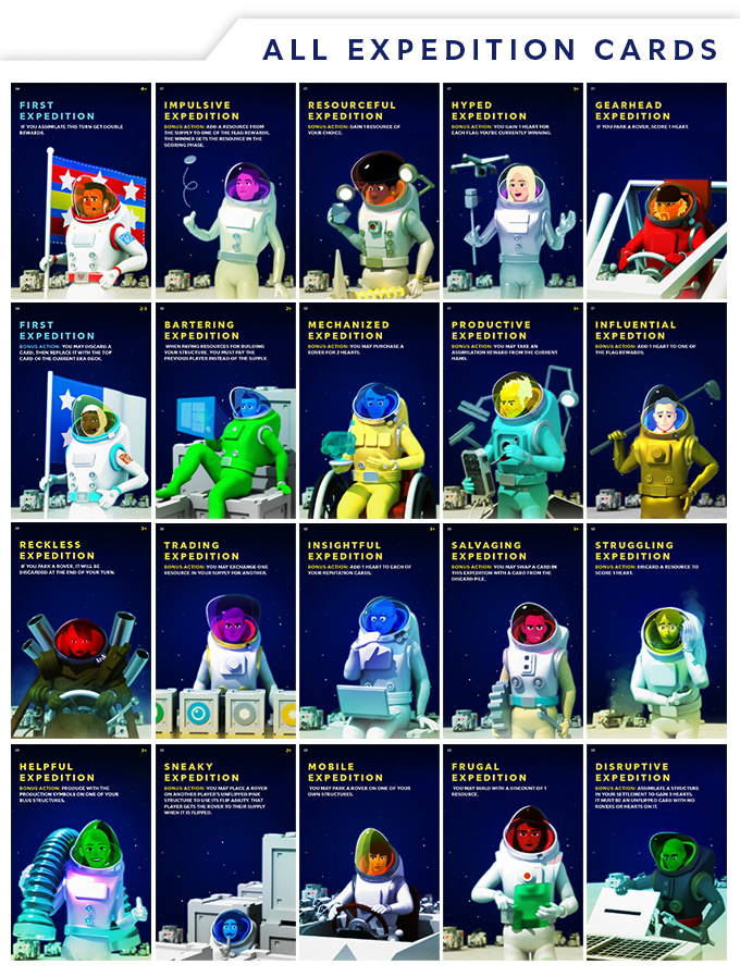 Each hand of cards contains an Expedition card that grants an optional free action. Expedition cards stay in the same hand and are passed from player to player. They are refreshed from a new deck every era, so the opportunities they offer constantly shift around the table and through the eras.