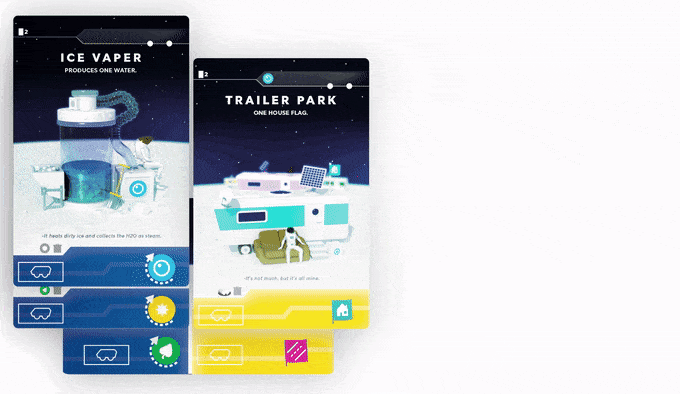 In a game of Moon, players will choose one card from their hand and then pass the remaining cards to the player on their left. Each hand of cards represents an expedition travelling from one lunar settlement to another, offering blueprints and expertise along the way.