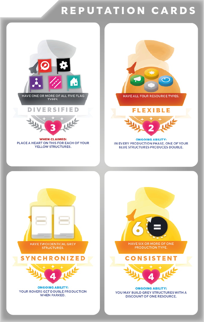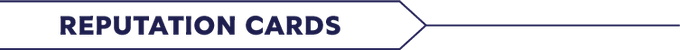 Each game also features a number of randomly selected "Reputation" cards which provide one-time or ongoing bonuses for the player who meets the requirement and claims the card.