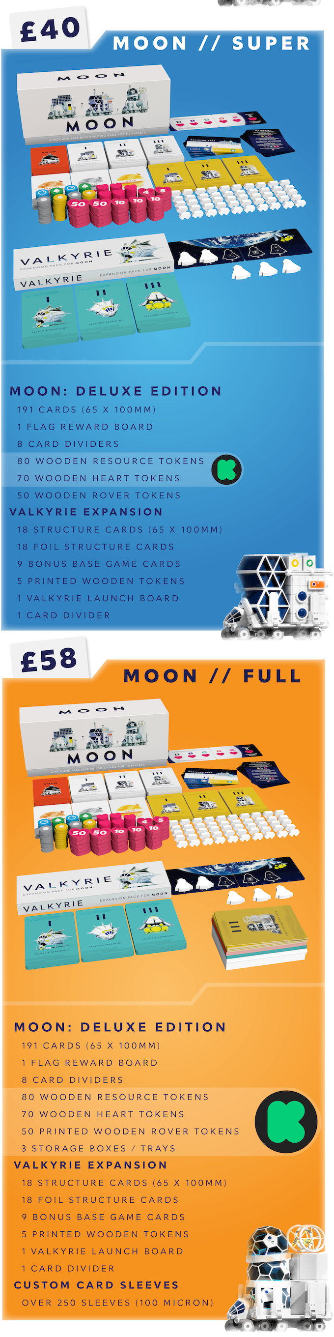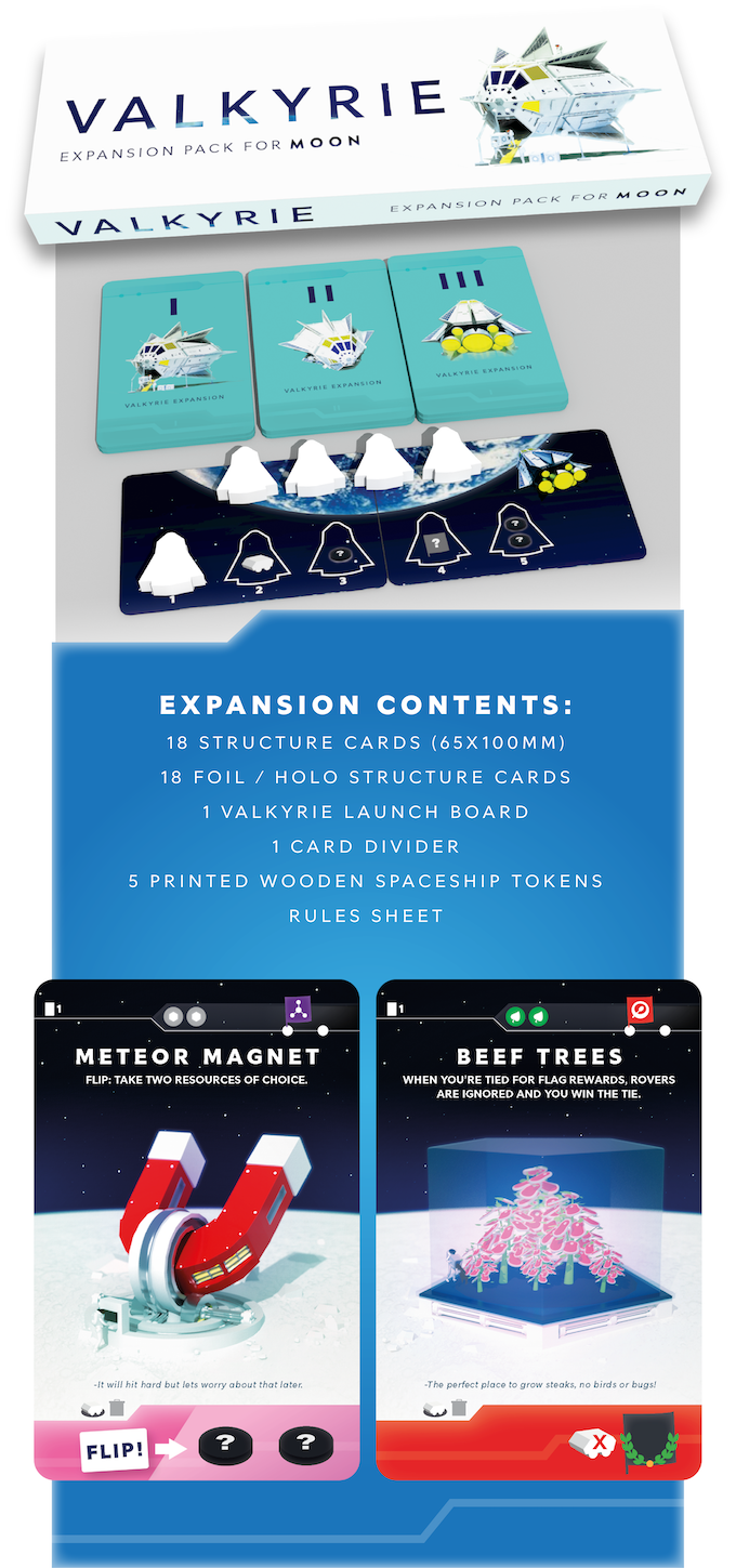 Valkyrie is an expansion for Moon that is included FREE with every copy of the game sold on Kickstarter - after the campaign, its MSRP will be £10.