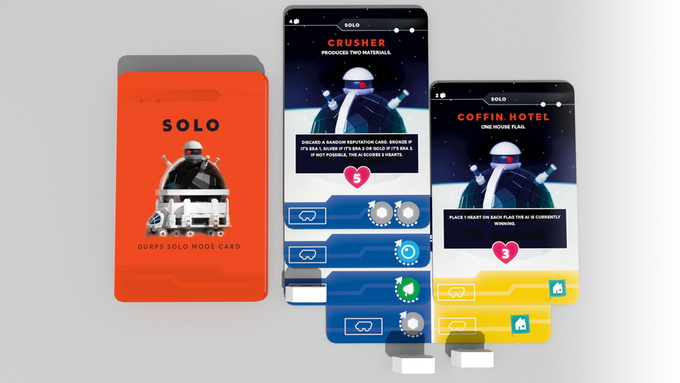Moon comes with a great solo mode straight out of the box. A deck of cards pits you against General Universal Recursive Profit Systems (GURPS), a challenging AI opponent.