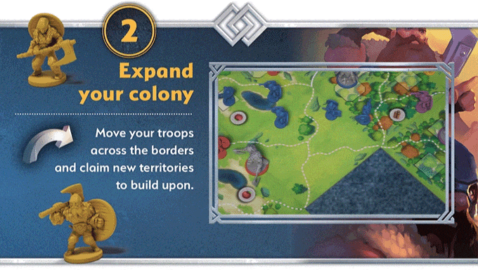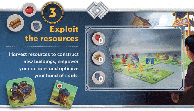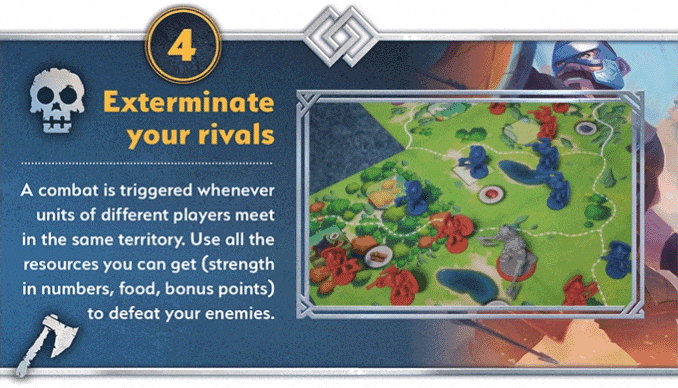 The game focus is on streamlined rules and mechanisms, allowing for a fast-paced and smooth rhythm of play. Each turn, players alternate their actions to adapt their strategies to their opponents' moves and the expansion of the board. Fame (i.e., points) can be earned by exploring, fighting, and controlling and developing territories. The various corresponding actions are played through the cards that the players have in hand. At the end of each turn, they have to choose a new card to improve their personal deck as their clans develop new tactics and technologies.