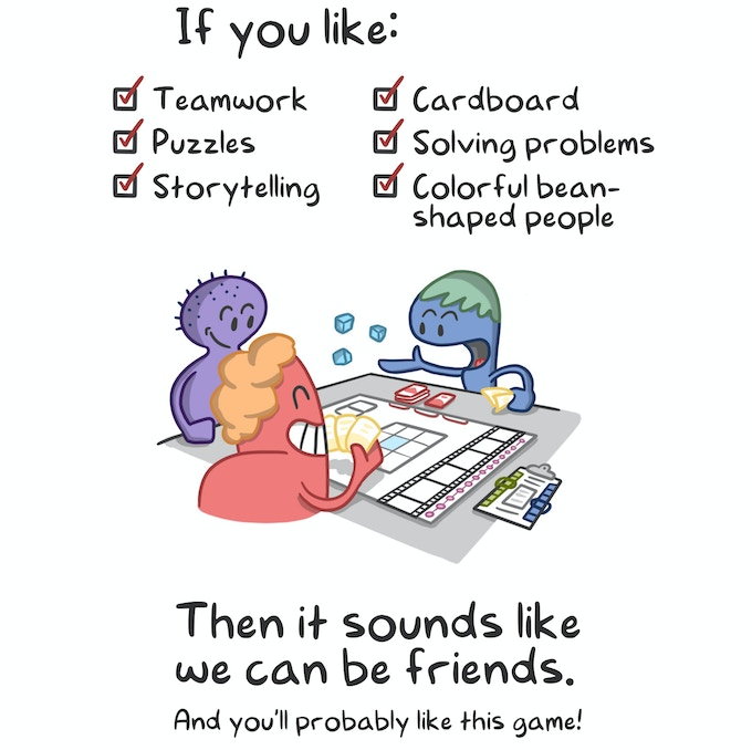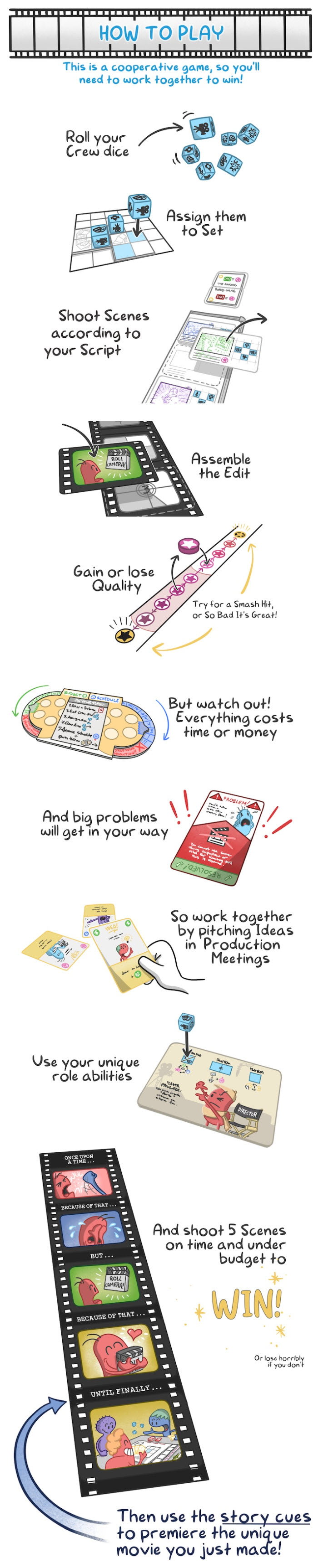 Place the Crew in specific arrangements matching those on the Shot cards, resolve the constant Problems getting in your way, and hold production meetings to play Idea cards from your hand to help out. Everything costs time and money, and you lose if either one runs out. You must also ensure your film reaches a certain level of Quality in order to win!
