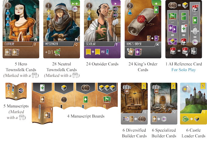 This expansion introduces the new King's Order and Outsider Cards, new Building Bonus Cards, Manuscript Boards, and plenty of new Townsfolk, Heroes and Manuscripts Tiles.