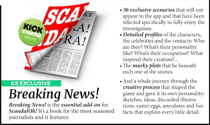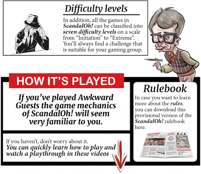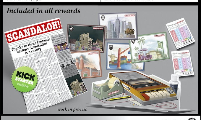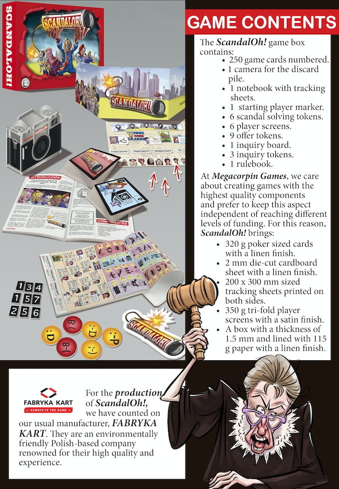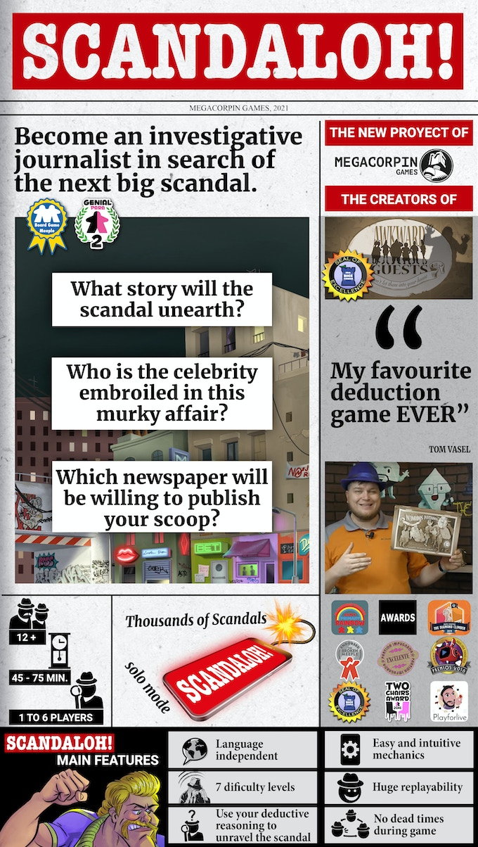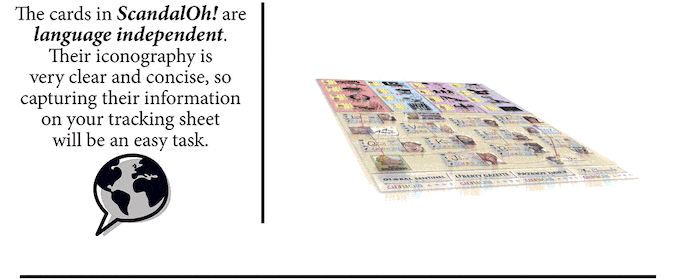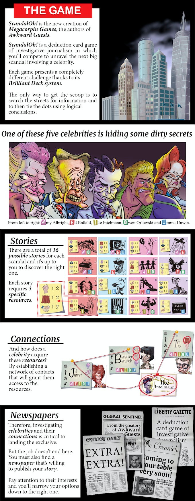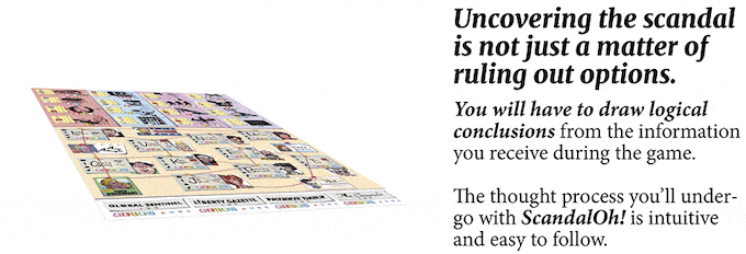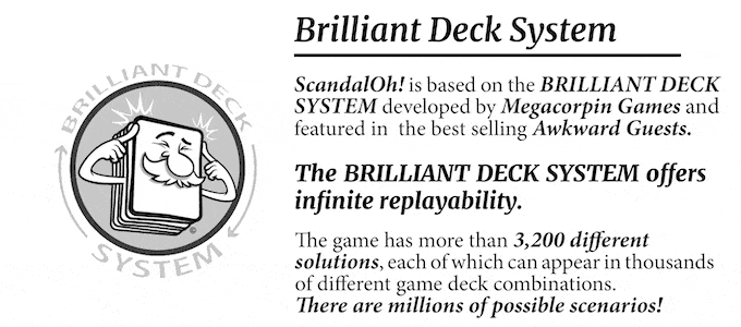 ScandalOh! is a "Brilliant Deck System" deduction game about investigative journalism in which each playing presents a different scenario, and players have to bring a scandal to light.