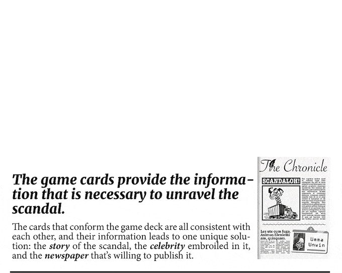 After each round ends, players can try to uncover the scandal. If the actual scandal is not revealed, players discard part of their hands and receive three new cards. The player or players who uncover the scandal first win.