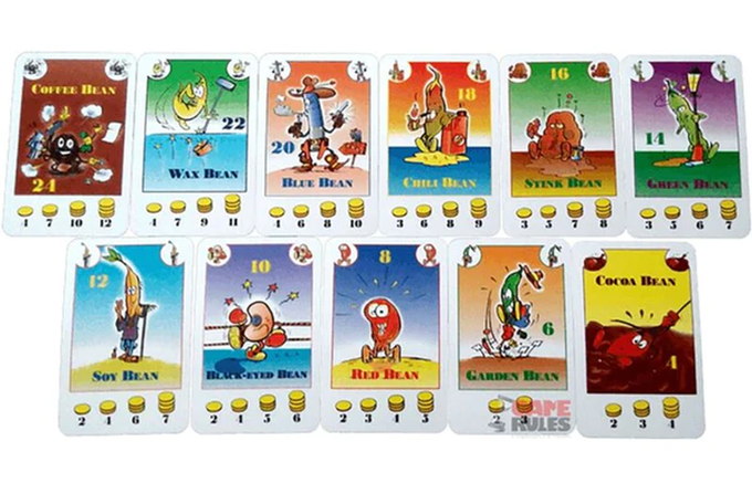 When you harvest beans, you receive coins based on the number of bean cards in that field and the "beanometer" for that particular type of bean. Flip over 1-4 cards from that field to transform them into coins, then place the remainder of the cards in the discard pile. When the deck runs out, shuffle the discards, playing through the deck two more times. At the end of the game, everyone can harvest their fields, then whoever has earned the most coins wins.