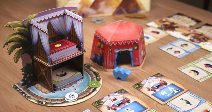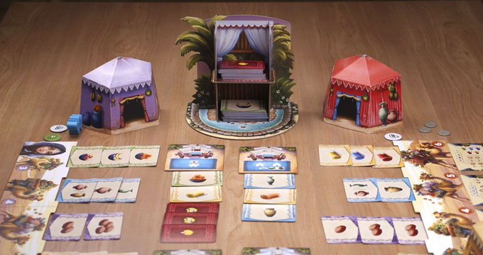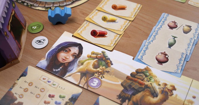 The winning bidder chooses a market, uses the power of that market (if they wish), then takes all of the goods from that market, flips them face up (if needed), then loads the goods on their camels. A camel can hold goods of only one type, and if a goods type is on a camel, then you must continue placing that good on the same camel. Each camel has a goods limit, however, and if you exceed that limit, then you must throw away all of that type of good.