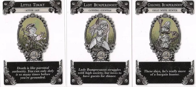In the GLOOM card game, you make your eccentric family of misfits suffer the greatest tragedies possible before helping them pass on to the well-deserved respite of death. Just mix the 55 transparent cards in this set together with your copy of GLOOM to add morbid new Modifiers, Events, and Untimely Deaths, and a new family of intrepid explorers who've faced misfortune across the globe. These days Colonel Bumpersnoot is really more of a bargain hunter, while Lady Bumpersnoot struggles with high society -- but she always loves to have guests for dinner. Their Towering Treehouse is included as a Residence card to use with the Unhappy Homes expansion.