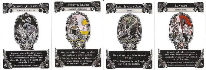 Gloom: Unfortunate Expeditions also introduces expeditions into the game. Only one expedition can be in play at a time. An expedition's rules affect all players as long as it remains in play. When you play a modifier of untimely death that has an expedition symbol, resolved the immediate effects of the card, then replace the current expedition with the one shown on the card. Some cards also have special effects that occur if an active expedition is already in play when the card is played.