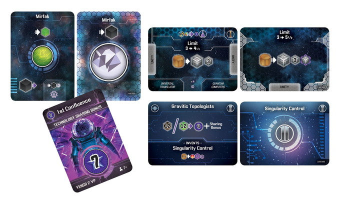 Each game round contains an open trading phase in which all players can negotiate and execute deals for cubes, ships, colonies, even the temporary use of technologies! Players with enough resources can also research technologies, upgrade colonies, and spend resources on their race's special cards during this phase. Once complete, all players simultaneously run their economies, spending resources to gain more resources. The Confluence follows, starting with players sharing newly researched technologies with all other races and following with bidding to acquire new colonies and research teams. Researching a new technology grants many victory points for the prestige of helping galactic society advance. When one race builds a new technology, it is shared with everyone else. Technologies can be upgraded when combined with other technologies.