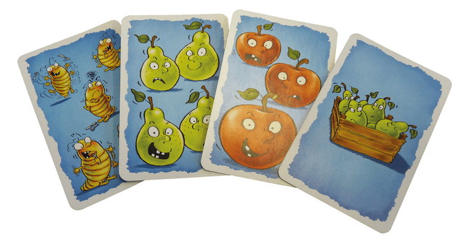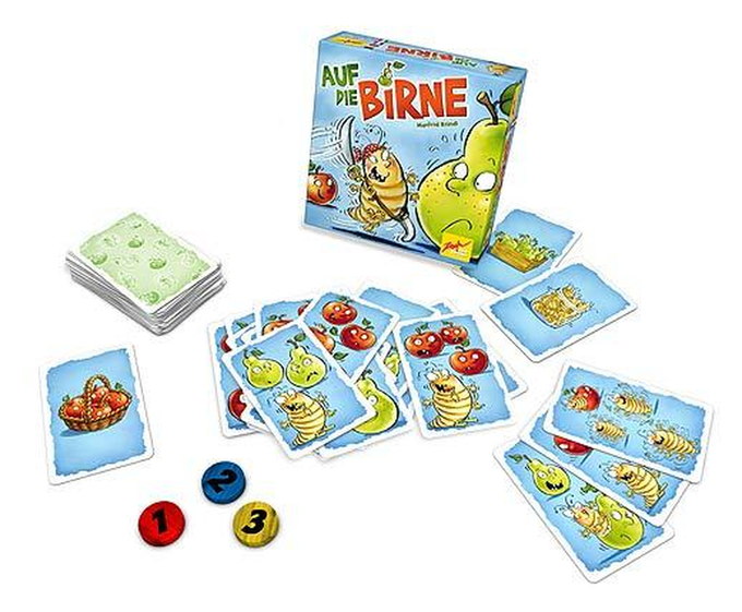 Auf die Birne is a counting, memory and reaction game played with a deck of 60 windfall cards – each showing some combination of apple, pear and grubs – and 20 harvest cards.