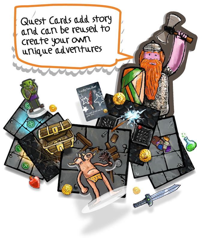 Whimsical and family-friendly narrative emerges during the game via the "quest cards" that are spaced out within the dungeon deck. When a quest card is placed in the dungeon you read a short passage from the quest book and carry out any special instructions it gives you.
