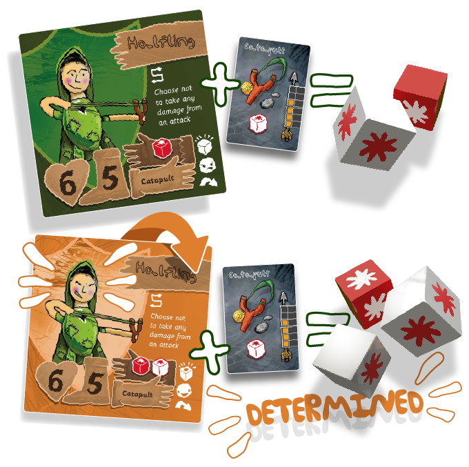 If you're in combat and you completely miss your target your hero flips over to their "determined" side. This means you will get even more dice to roll for your next attack. This helps take the sting out of rolling badly for younger children (and for adults too).