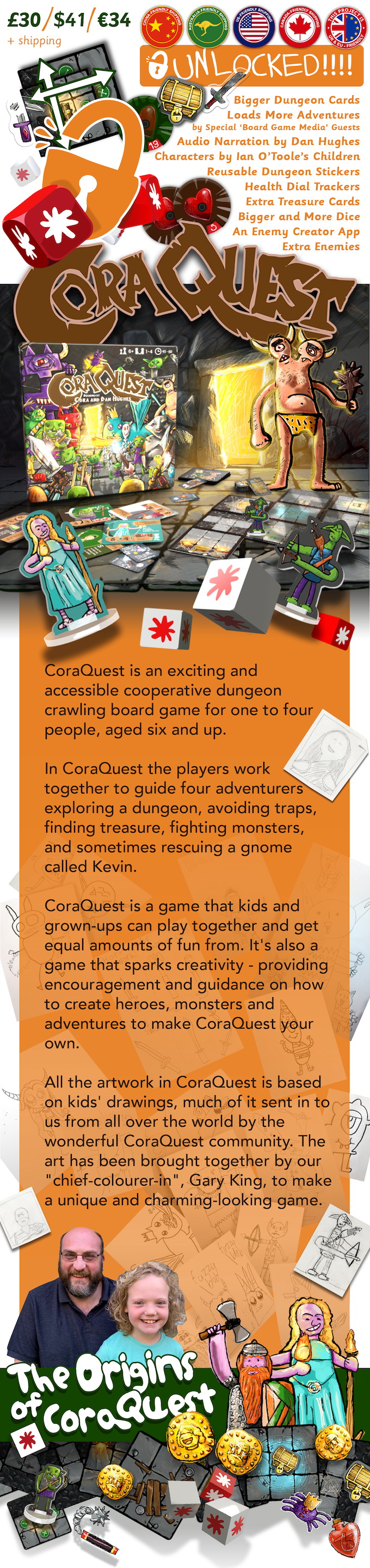 CoraQuest is a game that kids and grown-ups can play together and get equal amounts of fun from. It's also a game that sparks creativity - providing encouragement and guidance on how to create heroes, monsters and adventures to make CoraQuest your own.