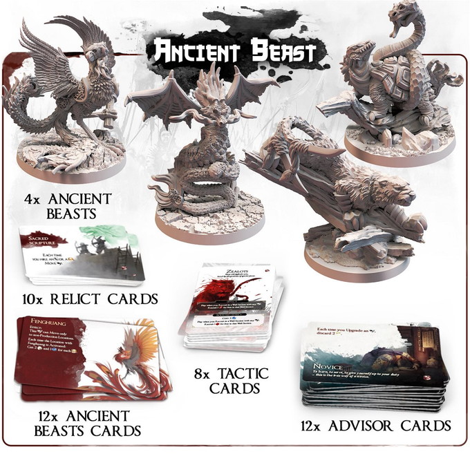 With four unique miniatures representing the Beasts, you also gain 12 new Advisor cards and 10 Relic cards that provide an additional way to move the Beasts. Besides that, this expansion contains Ancient Beasts cards and Tactic cards that extend the Tactic deck from the core game.