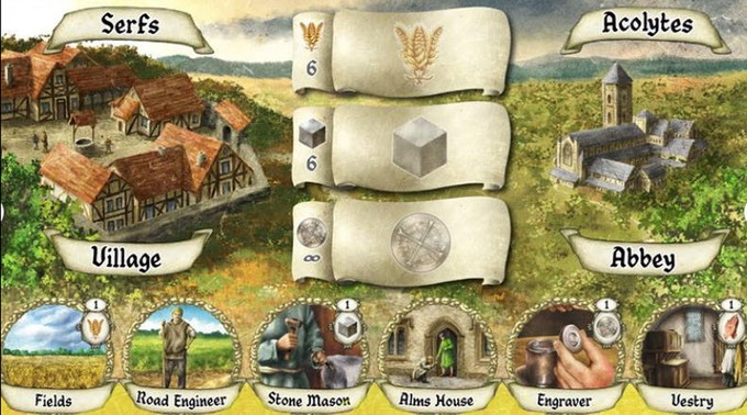 A unique twist on a mancala-movement mechanism distributes a player's acolytes across eight duties and the capital city to determine each turn's action. 18xx-style tile development on the map board builds trade routes for revenue and pilgrim trails for endgame points. Common serfs need to be ordained to ensure that the abbey is adequately serviced and your acolyte numbers will need to be carefully balanced across ever changing duties and vocational tasks.