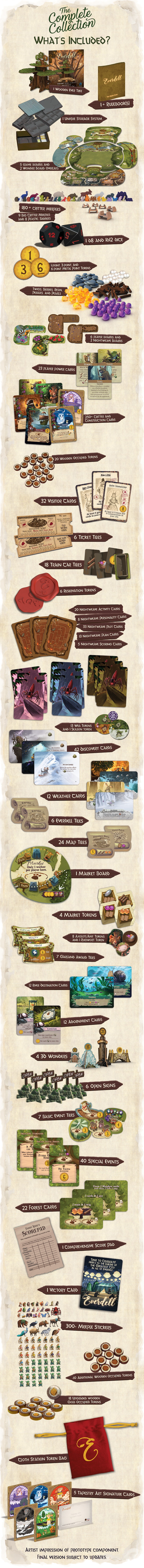 Contains all the Everdell expansions and Collectors Edition content.  Specialized trays and dividers for easy storage of boards, resources, and cards.  Beautifully illustrated consolidated rulebook and card reference: The Gilded Book and The Archive.