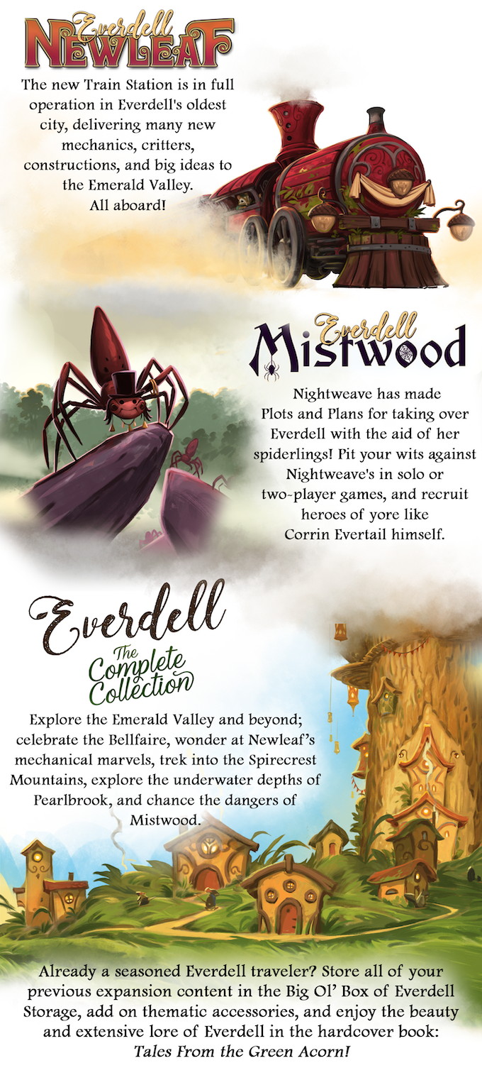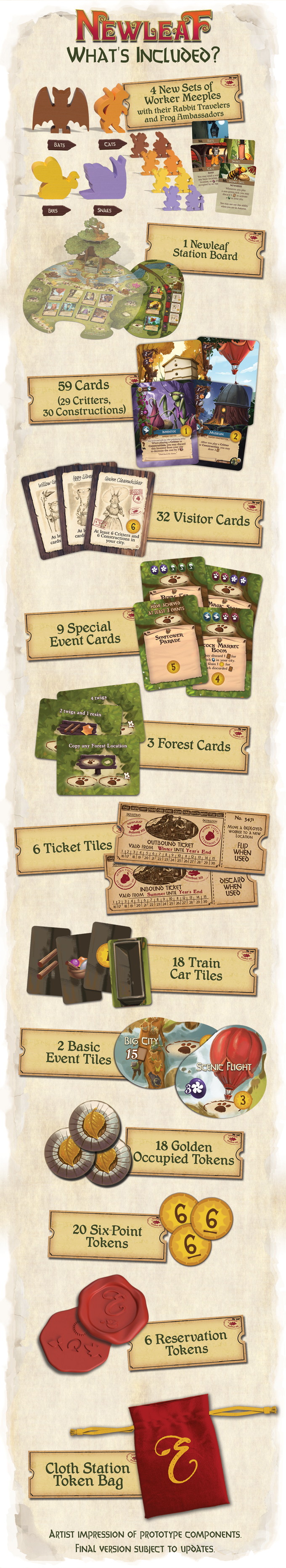 New critters and new ideas are arriving every day at the Newleaf train station! Being the first official city of Everdell, Newleaf has grown into a thriving destination with numerous exciting opportunities to discover and explore. Attract eager visitors to your city, make your reservations, travel further with tickets, and build the most prosperous city Everdell has ever seen! Prepare to experience an all-new Everdell that will keep delighting and surprising you for many more seasons to come.