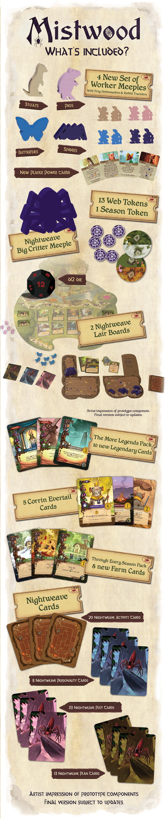 Lurking in the depths of Mistwood, the cunning and villainous Nightweave plots to take over Everdell with the aid of her spiderlings. Pit your wits against Nightweave and her sticky schemes in both solo and two-player games, and recruit heroes of yore from our More Legends and Corrin Evertail expansion packs as well as transform your farms with our new Through Every Season expansion pack!