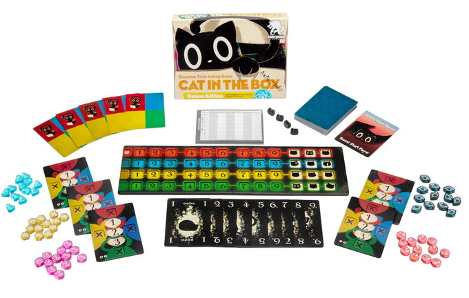 Cat in the Box: Deluxe Edition is the quintessential quantum trick-taking card game for 2 - 5 cool cats, where your card’s color isn’t defined until you play it! Hypothesize how many tricks you will win, and record your bid. Place tokens on the community research board as you play your hand, and connect large groups of tokens to score even more points. Plan your tricks carefully as you cannot claim the color of a card with the same number that has already been declared. Doing so would be pawsitively catastrophic as you have just created a paradox!