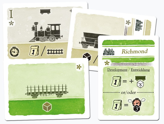 To do this, they use cards that consist of rail equipment and locations to move their train between those locations to pick up and deliver the goods in supply and demand. This movement of their trains is recorded on the "time track", which indicates how many day players are spending for actions. Efficiency is important, as is the ability to deliver specific goods just in time to certain destinations.