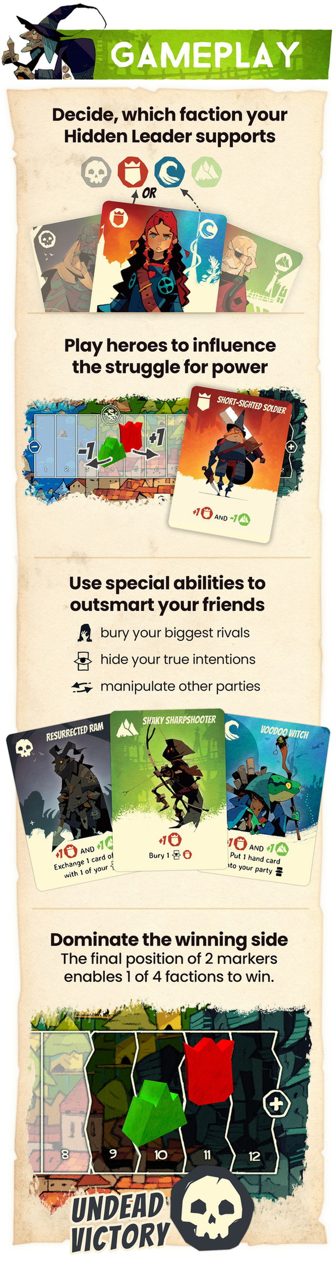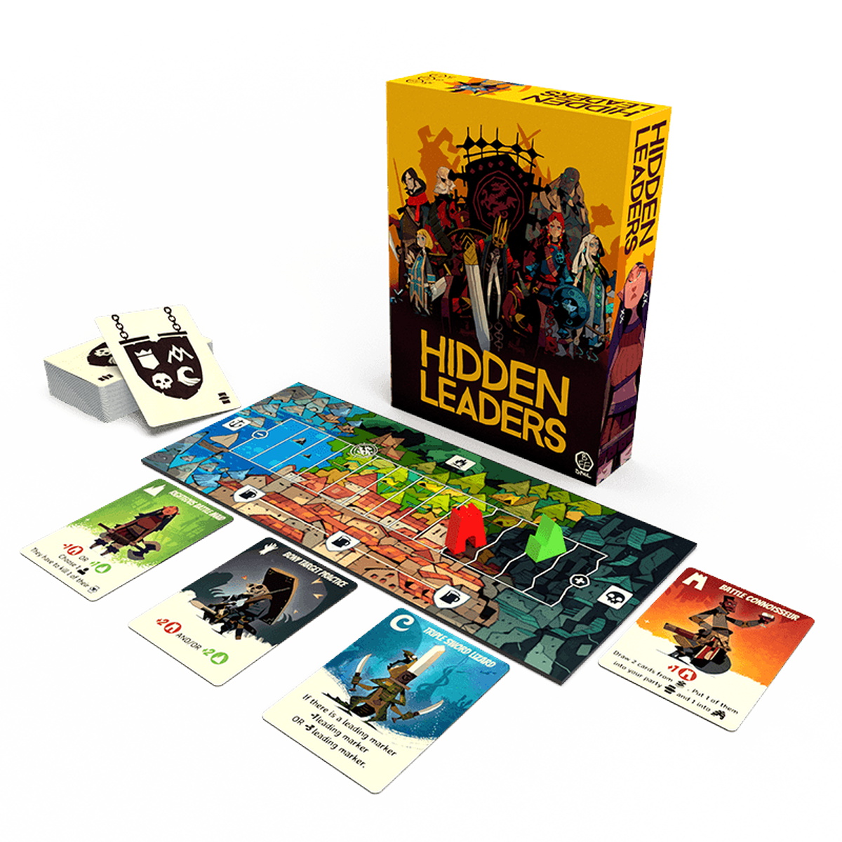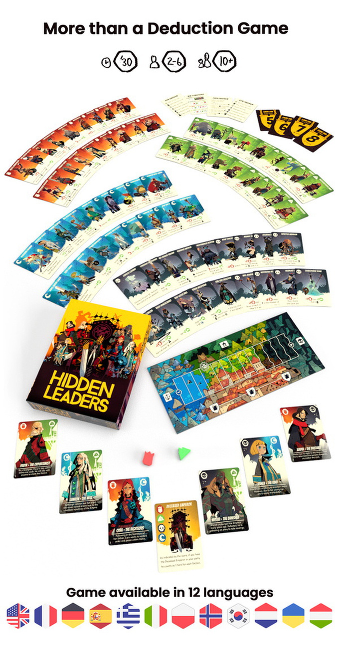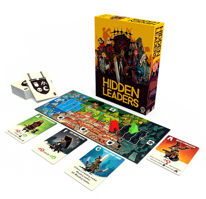In Hidden Leaders, you take the role of one of six secret leaders, each of them is allied with two of the four factions/colors. By playing heroes into your tableau, either openly or secretly, you influence the outcome of the conflict.