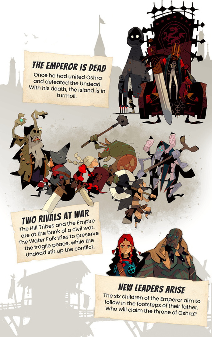 The island of Oshra is in turmoil. Following the death of the Emperor, the conflict between the Hill Tribes and the Imperial Army escalated. While the Water People try to maintain balance between the old rivals, the Undead aim to escalate the war. All hope rests on the six children of the Emperor: Who of them will claim the throne?
