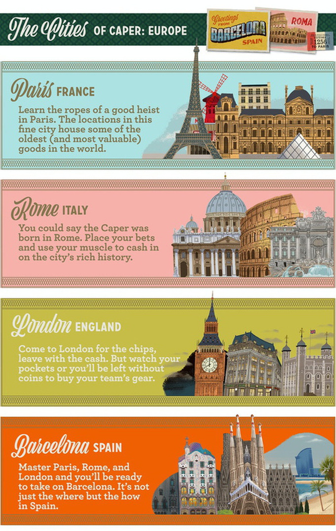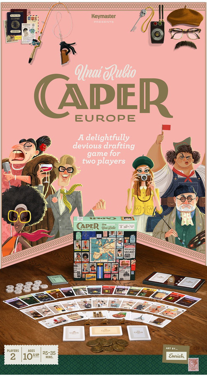 Caper: Europe is a two-player drafting game. You take turns sending thieves to famous locations across Europe, vying for control through special card powers. These thieves have tricks up their sleeves, which you can enhance by adding gear to them. And controlling the locations isn't everything because priceless stolen goods await the thief who's clever enough to snatch them first.