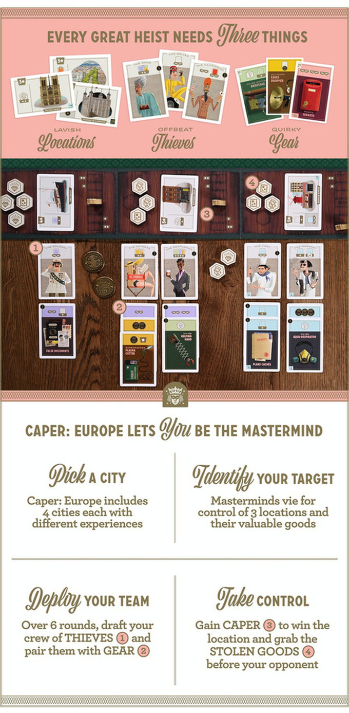 Your role as criminal mastermind is to recruit a crew of thieves, send them to locations across Europe, and provide them with gear. It's your job to utilize your resources efficiently to steal goods, but being a great mastermind is about more than the things you walk away with. It's the thrill of a well thought-out plan coming together: the set-up, the sting. Properly deploy your thieves and gear to dominate locations, outmaneuver your opponent's plans, and win the night. You've got six rounds to plan and play your cards. Nothing like a tight timeline to up the stakes!