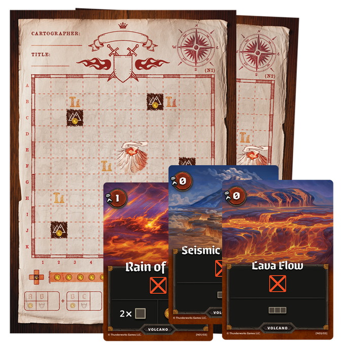 It includes 75 double-sided new map sheets featuring a volcano space and 3 volcano cards, which are shuffled into the Explore deck. When volcano cards are revealed, players draw destroyed spaces on their map sheets recording the damage the volcano is inflicting on the land.