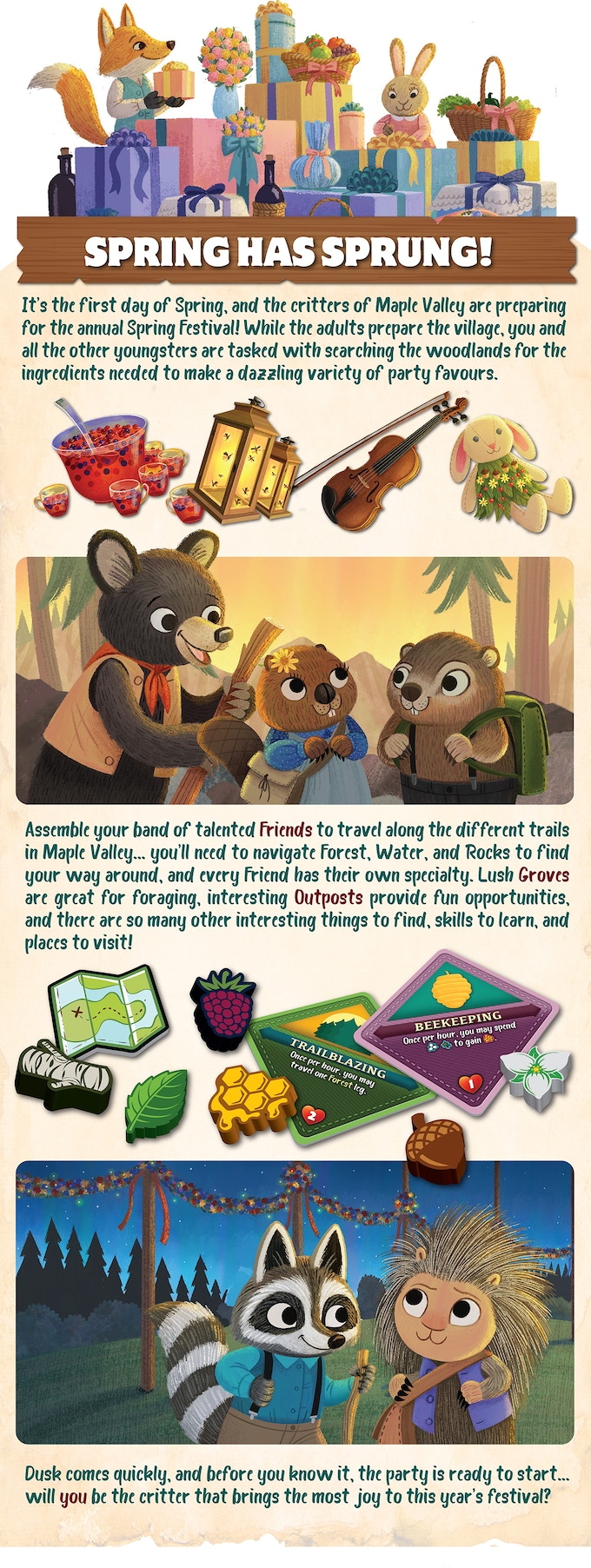 While the adults get the village into shape, the youngest (and swiftest) forest animals from each den are sent scrambling through the blossoming woods, completing the last-second tasks that will make the Festival a success. The trails aren't always clear; you'll need to climb, swim, and dig your way to the most bountiful groves, forage for fresh spring ingredients to help villagers complete their errands, and unearth curiosities that will attract skillful scouts to your growing team. The sun will set before you know it; will it be your hard work that makes this year's Festival the best one ever?