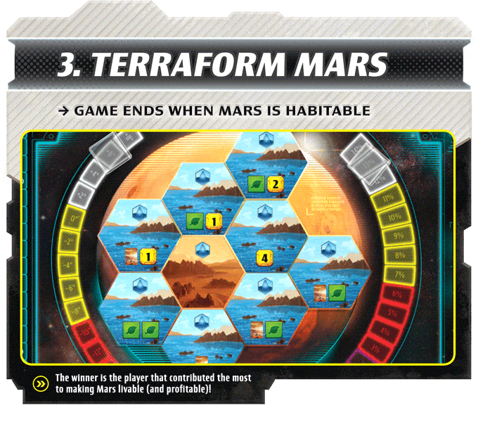 Handle all the crises as they arise. Eventually, a Crisis card will be drawn that allows the players to win the game once they have completed re-terraforming