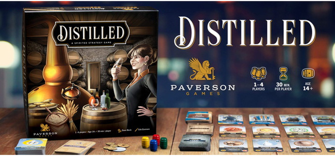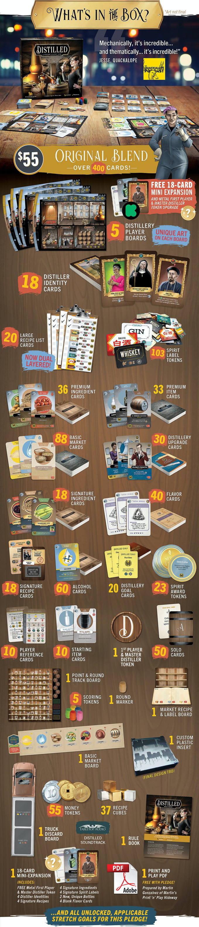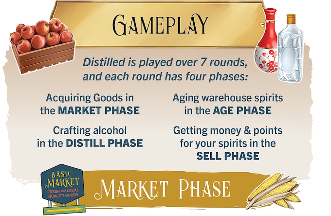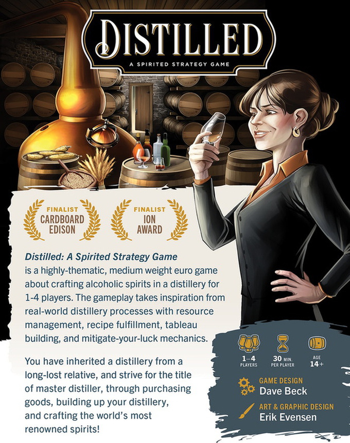 Distilled is a highly thematic strategy card game about crafting spirits in a distillery, with resource management and push-your-luck elements. In the game, you have inherited a distillery, and are hoping to someday achieve the title of master distiller through purchasing goods, building up your distillery, and creating the world’s most renowned spirits.