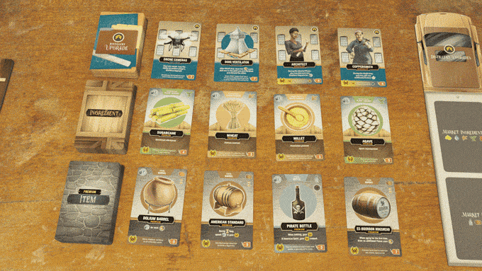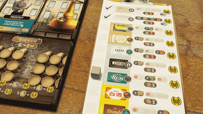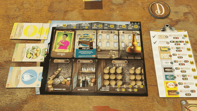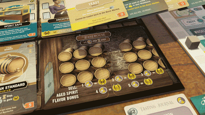 Age your spirit by placing the stack under a barrel card and sending it to the warehouse. Each round it stays in the warehouse, add a facedown flavor card to the barrel, increasing its prestige and value.