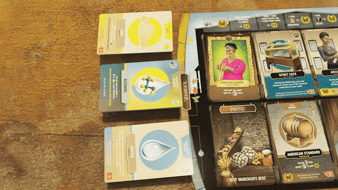 Shuffle your ingredients together to distill the spirit, then pull the top and bottom cards from the deck and place them in the pantry. This represents removing the impure first and last parts of the run, which are saved for future distillations.