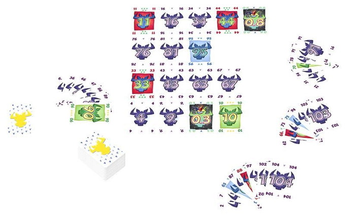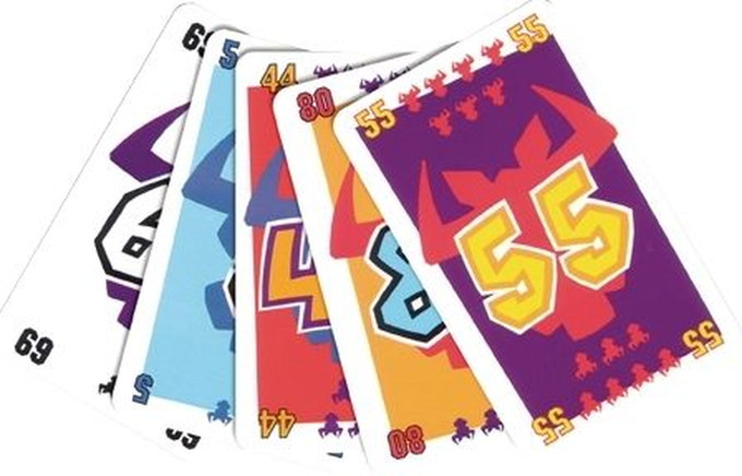 In addition to a number from 1 to 104, each card has a point value. After finishing ten rounds, players tally their score and see whether the game ends. (Category 5 ends when a player has a score greater than 74, for example, while 6 nimmt! ends when someone tops 66.) When this happens, the player with the fewest points wins!