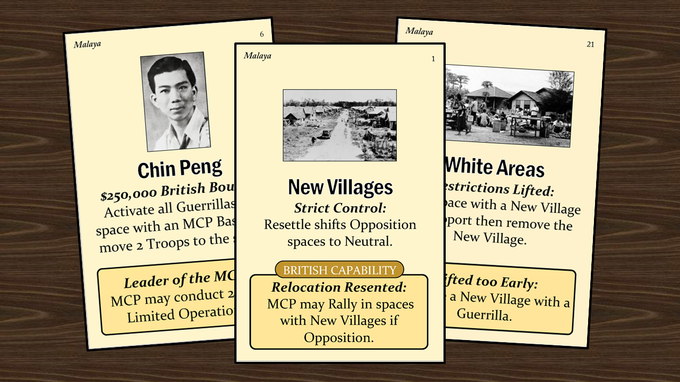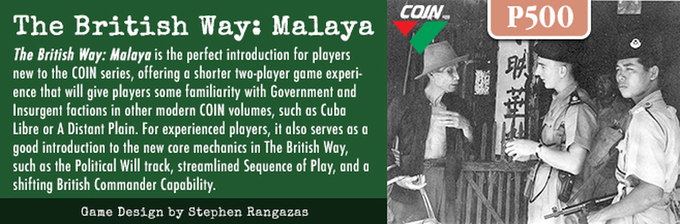 The British Emergency in Malaya (1948-1960) is viewed by some as the classic case of a successful counterinsurgency campaign, fought against an insurgency led by the Malayan Communist Party. The Malayan Emergency significantly influenced counterinsurgency theory and would become a model case, later appealed to by commanders in conflicts ranging from Vietnam to the present. The British Way: Malaya is the perfect introduction for players new to the COIN series, offering a shorter two-player game experience that will give players some familiarity with Government and Insurgent factions in other modern COIN volumes, such as Cuba Libre or A Distant Plain. For experienced players, it also serves as a good introduction to the new core mechanics in The British Way by offering Factions and Operations that will be familiar from previous COIN volumes but with several new systems, such as the Political Will track, streamlined Sequence of Play, and a shifting British Commander Capability.