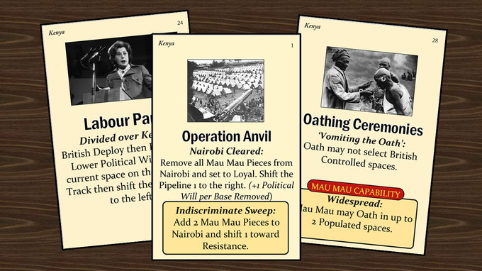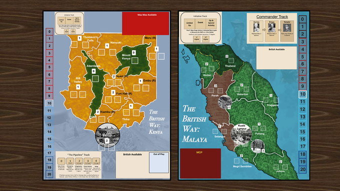 The British Emergency in Kenya (1952-1960), fought against the Mau Mau insurgents, dramatically departed from the strategy modeled in many of the modern COIN volumes, with a heavy focus on coercion rather than winning ‘hearts and minds.’ In game terms, this means a shift away from building ‘Support’ towards new mechanics modeling various forms of repression used by the British in Kenya. However, their use of repression can have political consequences back in Britain, represented as a potential penalty to Political Will—as one British official noted, “If we sin, we must sin quietly.” The British player must balance this core tradeoff, while the Mau Mau player must mobilize the Kikuyu population and expand their revolt to survive the overwhelming British response. The British Way: Kenya depicts a dramatically asymmetrical conflict where an extremely poorly equipped insurgency must utilize clever (and in some cases brutal) tactics to try and ride out an overwhelmingly powerful, often unconstrained, and increasingly criticized counterinsurgency campaign.
