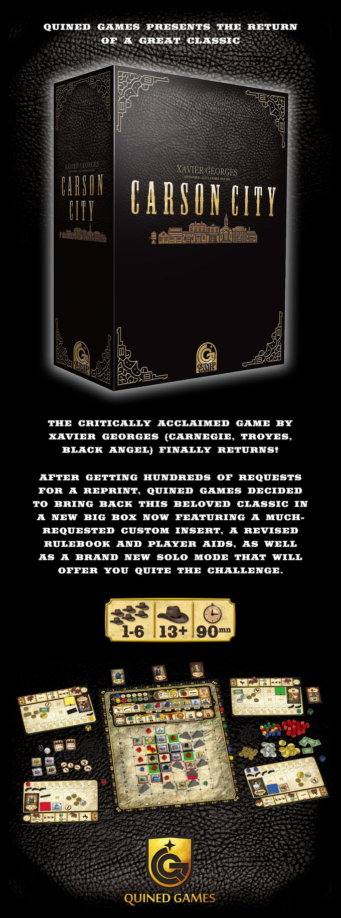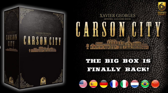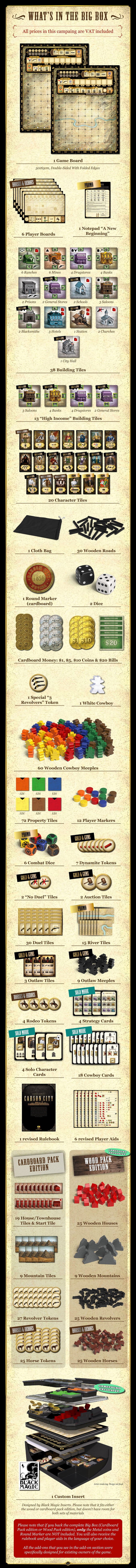 Carson City: Big Box is a collection of the Carson City base game, the Gold & Guns expansion, and the Horses & Heroes expansion. The game board has been redesigned and updated to support a sixth player and the Horses & Heroes expansion. The game is played in four rounds, and in each one of them, the players choose one of the characters, which give certain advantages. When several players claim the same action, a duel is fought, and the player with the most firepower wins the action. In the end, the most prominent citizen in Carson City — as measured by victory points that can be won both during and after the game — wins.