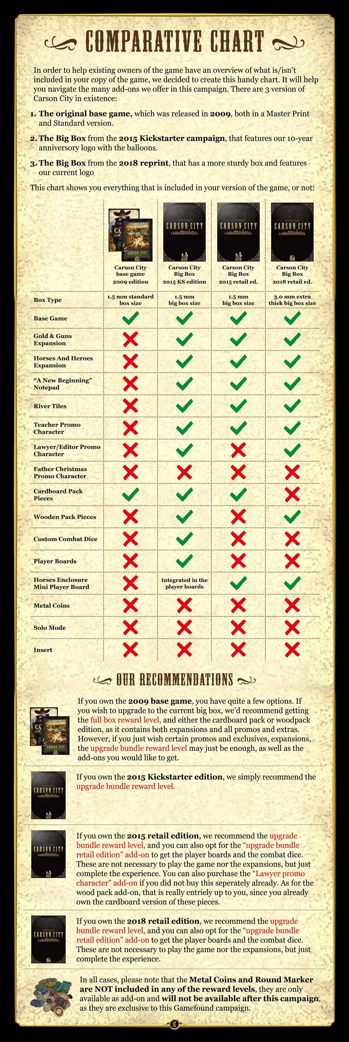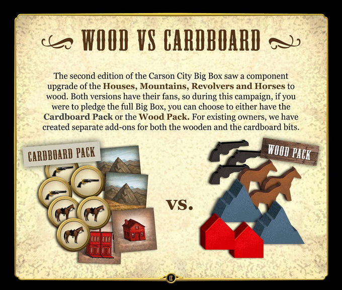 Carson City: Gold & Guns, the first expansion, contains updated buildings and houses, new buildings, new double-sided characters, the "Indian" character (previously a promotional item at Spiel 2010), and a separate expansion called "The Outlaws".