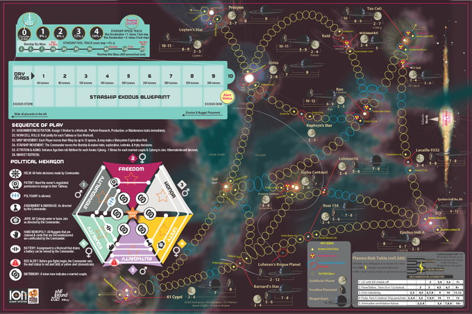 Aboard the Starship Exodus, players control seven spacefaring human-machine hybrids embarking on an epic pilgrimage to the stars. The journey will last many decades as you perform actions and place workers to develop technology for survival, terraforming, and colonization along the way.