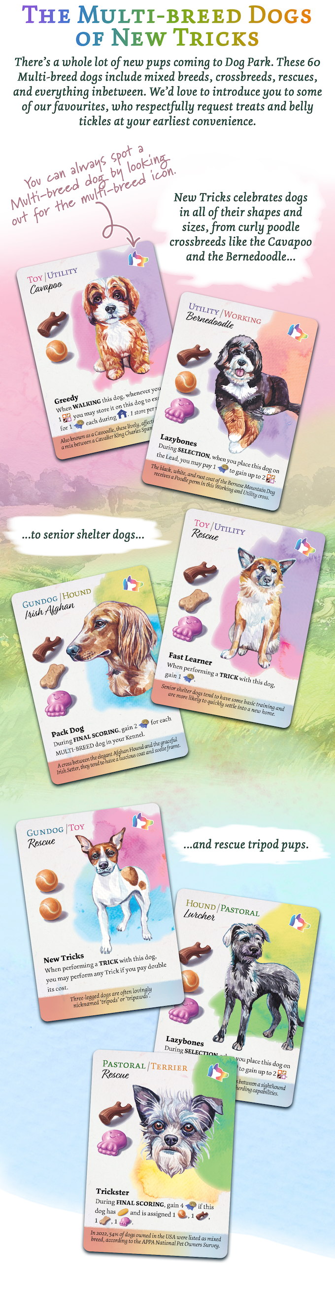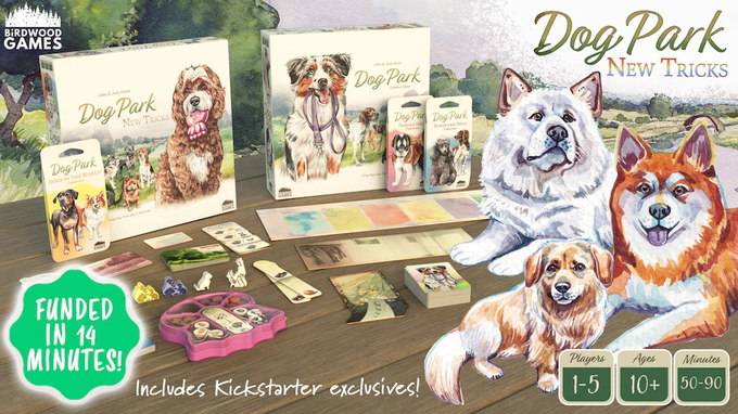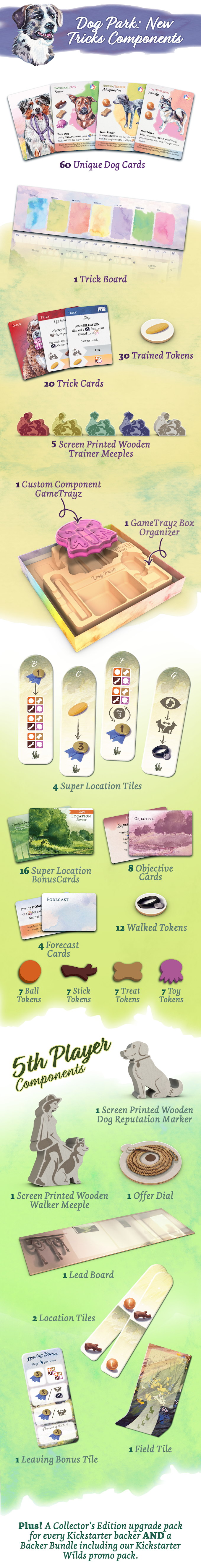Dog Park: New Tricks adds three major elements to the Dog Park board game: Multi-breed dogs, Trick training, and Super Locations. You are still trying to become the most accomplished walker by earning the most Reputation, but now you have more layers of strategy to explore and use to your advantage.