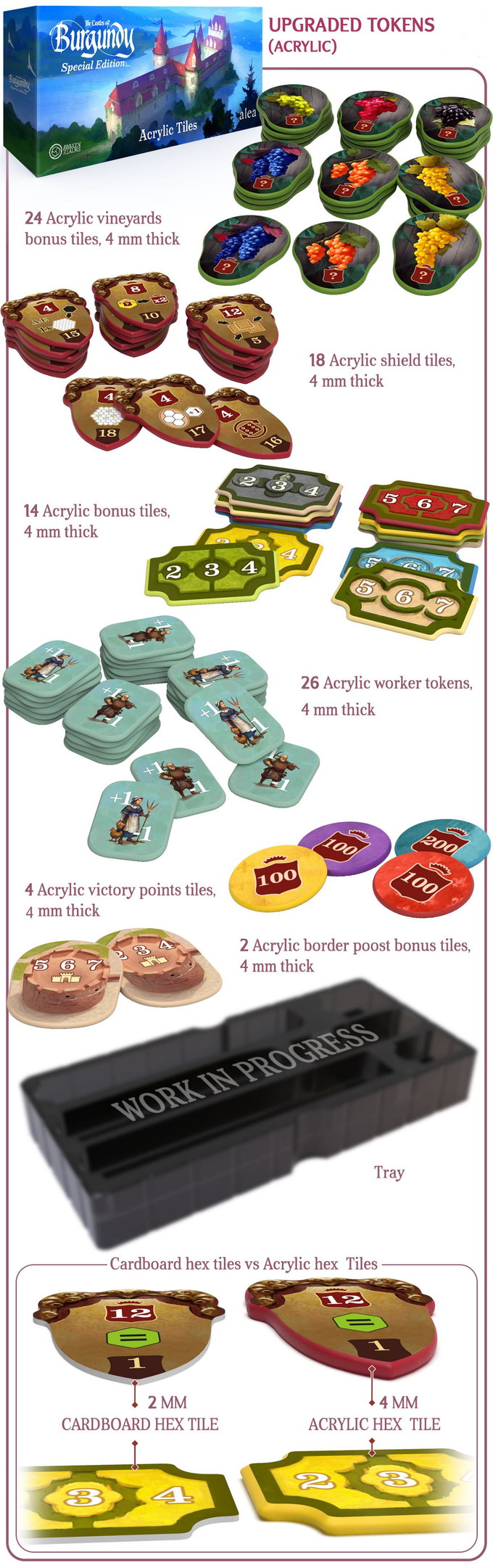 Extra set of high-quality acrylic tokens containing 26 worker tokens, 12 bonus tiles, 4 victory point tiles, 18 shields and 24 vine bonus tiles for Castles of Burgundy: Special Edition.