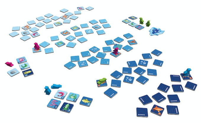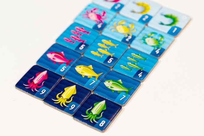 Turns are simple: Flip over an ocean tile, and see what you reveal. You can take what you reveal in the shallows or dive deeper, hoping for a larger catch — but the deeper you go, the more plentiful the predators become. As you surface with food, you build sets of three colors. Target the colors you need to complete sets and score the maximum number of points.